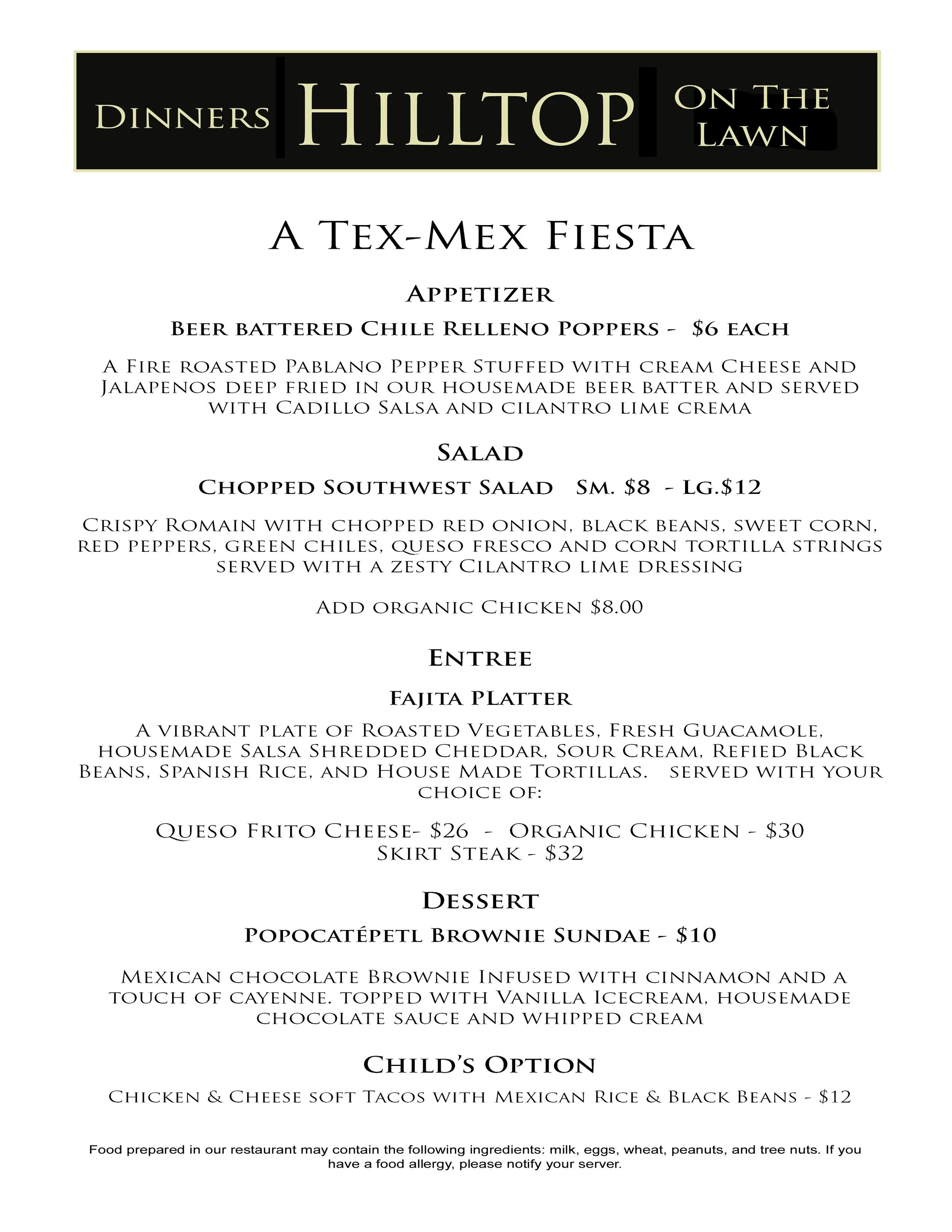 HILLTOP DINNERS ON THE LAWNROTATING MENUSINDIAN CUISINEOctober 3-4 & November 28-29 FRENCH BISTROOctober 10-11 & December 5-6 KOREAN BARBEQUEOctober 17-18 & December 12-13 TEXASJULY 24-25 & December 19-20 MEDITERRANEANOct 31-Nov 1 & December 26-27 ITALYNovember 7-8 & January 2-3 SPANISH TAPASNovember 14-15 & January 9-10 ASIAN STREET FOODNovember 21-22 & January 16-17 HILLTOP PUB MENUAVAILABLE EVERY WEEK CRAFT BEER LIST WINE LIST